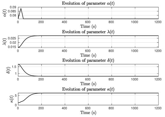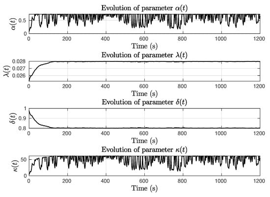 The evolution of the adaptive gains is seen in Figure 8. It is evident that the influence of the unknown disturbance is passed to and in order to maintain steady-state performance, but it has no effect on lambda or the adaptive power factor delta. As a result, the reaction achieves a quick response to external disturbances in order to maintain a constant target performance related to the sliding condition .