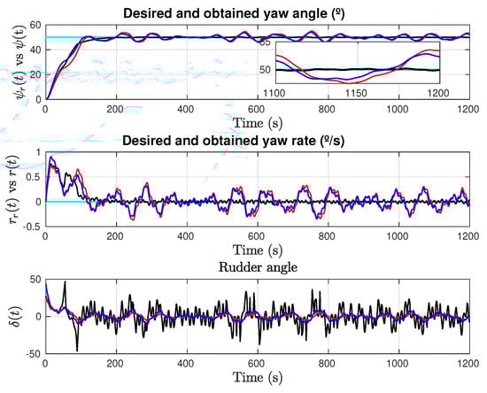 where, is the yaw (orientation) angle, is the yaw rate, is the rudder angle (the control variable to be designed) and is an unknown term to be compensated that includes parametric uncertainty and external disturbances (wind, waves, mobile loads). The dynamics functions are given as