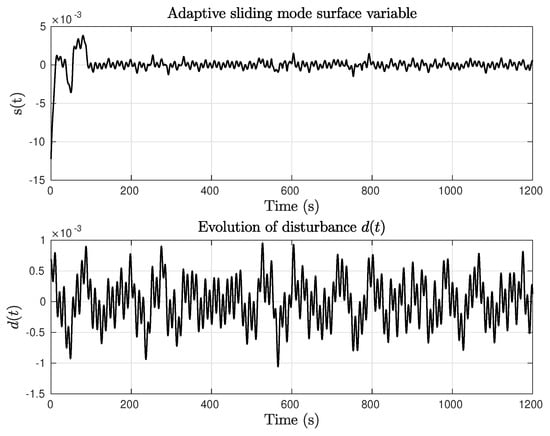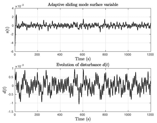 Figure 12 shows the evolution of the sliding variable and the external disturbance input . The time evolution of adaptive parameters in Figure 13 mirrors the behavior in the case of constant yaw reference in case of . This characteristic, like in constant yaw reference scenario, generates quick reactions to external disturbances, maintaining a desired fixed performance and avoiding a delayed response.