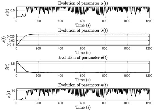 Sinusoidal yaw reference test with . Adaptive parameters evolution.