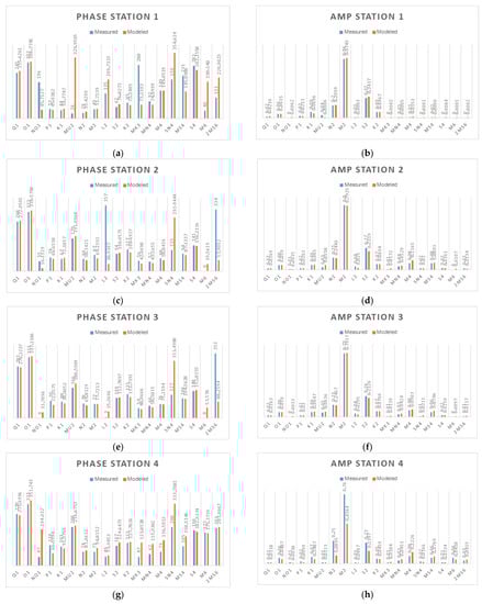 Station 1: This station is located approximatively near the inlet of the lagoon. The modeled phase and amplitude were compared to the previously measured ones for 19 waves (Table A1). The comparison outcome is well presented in the histograms in (Figure 4a,b). Regarding the phase for this station, values of measured and modeled results are in disagreement in certain waves like (NO1, MU2, L2, MK3, SN4, M6, 2MS6) (Figure 4a), while the modeled and measured amplitude results are perfectly in agreement in all the 19 waves (Figure 4b).
