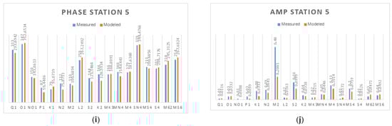 Station 5: The fifth and last station is located approximately in the very inner part of the lagoon, considering the inlets as the beginning. The last column of (Table A1) represents the outcome of phase and amplitude modeled and observed values. In this station, the modeled phase seems to be in agreement with the observations for all 19 waves (Figure 4i). Same as for the amplitude except for one wave (M2) with a difference estimated as ~0.2 m (Figure 4j).