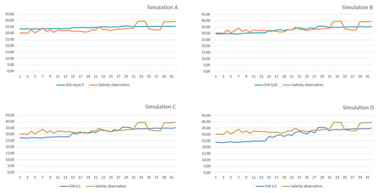 Modeled and observed salinity (PSU) comparison for each SGD input case (Simulation A): 0; (Simulation B): 0.05; (Simulation C): 0.1; (Simulation D): 0.2. With the x-axis representing the stations’ numbers and the y-axis representing the salinity values.