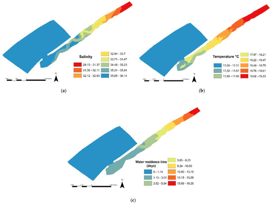 The average temperature in (Figure 6b) was modeled for the spring season between February and June 2013. The highest temperature is between 18 to 19 °C, in the inner and the middle parts of the lagoon, while the downstream water temperature is ~17 °C.