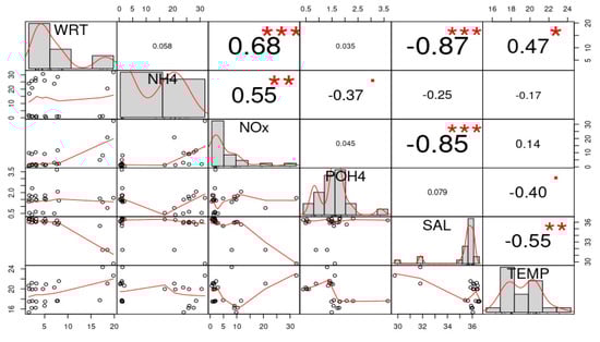Correlation matrix between monthly WRT and water quality parameters (Ammonium, Nitrate, Phosphate, salinity, temperature) (High tide). The distribution of each variable is shown on the diagonal. On the bottom of the diagonal: the bivariate scatter plots with a fitted line are displayed. On the top of the diagonal: the value of the correlation plus the significance level as stars. Each significance level is associated to a symbol: p-values (0, 0.001, 0.01, 0.05, 0.1, 1) <=> symbols (“***”, “**”, “*”, “.”, “ ”).