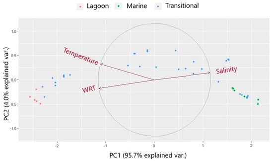 Calculated spatial distribution of WRT, temperature, and salinity reduced to coordinates in two PCA axes is consistent with lagoon zones developed earlier [26] using the benthic macroinvertebrate distribution (Table 3; Figure 8), showing clear gradients in these three parameters in the transition from the outer marine to the inner estuarine parts of the lagoon.