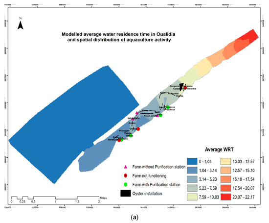 Oyster farming as the main aquaculture activity in the lagoon of Oualidia. It is also one of the main reasons why the lagoon has a touristic reputation. There are ten existing aquaculture farms in Oualidia (Table 4). Their annual production is estimated to be around ~254 t/year. The farm (1) is located where the minimum WRT was modeled for the year 2012, while the farm (10) is located in the inner part of the lagoon (Figure 9a) (Table 4).