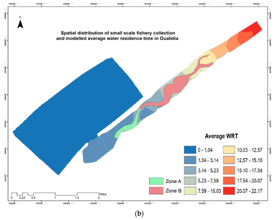 (a) Modeled average WRT in days in Oualidia lagoon for the year 2012 and spatial distribution of aquaculture activity; (b) Spatial distribution of zones of collection of invertebrates’ activity and modeled average WRT in Oualidia lagoon for the year 2012.