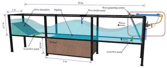 Submarine pipelines are widely adopted to transport the oil, gas, hydrocarbons and other liquids in ocean engineering [1,2]. When a pipeline is placed on the seabed, it will suffer the action of waves and current, resulting in the local scour occurring in the vicinity of the pipeline [3,4]. As the scour pit evolves along the pipeline, it will span the scour pit. If the free span is long enough, the pipeline begins to sag, leading to pipeline instability and failure [5,6]. In addition, the high pressure and temperature induced by the liquid in the pipeline create internal longitudinal stresses, resulting in pipe-buckling [1]. Oil or gas leakage induced by pipeline damage can cause serious disasters in the ocean’s ecological environment. For example, continuous oil leaks may lead to the failure of related safety valve, causing gas ignition, explosion, and structural damage with the further release of oil [1,7]. So far, considerable studies have been made to investigate the scour process beneath the submarine pipeline [8,9,10,11,12,13,14].