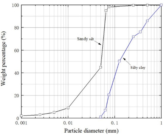 A series of laboratory tests were designed to validate the protective capacity of ISS-solidified slurry for pipeline in waves and combined waves and current, which were conducted in a wave-current flume with the dimensions 14 m × 1 m × 1.5 m (Figure 2, length × width × height) of Ocean University of China. A wave generating device was set on one side of the flume, which is composed of an electric controller, wave maker, and a piston rod. The wave absorption band with a length of 2 m and an inclination of 14° was placed on the other side of the flume, and it was made of gravel and rubble. A rectangle soil pit (1.4 m in length, 0.5 m in height) was installed in the center of the flume. The pipeline model is made of Polyvinyl chloride (PVC), and the diameter D is 2.5 cm. In experiments, the pipeline model was resting on the seabed without any gap, and it was rigidly fixed in whole scour tests to avoid the sagging of the pipeline. The wave height gauges were set on the upstream section close to the pipeline model, and the Acoustic Doppler Velocimeter (ADV) was adopted to acquire the near-bed velocity with a distance of 5 cm (2 D) above the seabed. In order to obtain the instantaneous scour depth, the scour probes were installed vertically on the bottom of the pipeline. The evolution of the scour pit in tests was videotaped by a camera, so the whole process for the onset of the scour and scour evolution can be monitored and recorded completely. The Figure 3 depicts the particle size grading curve of the sandy silt, and it was used as the initial (untreated) seabed. The physical parameters of the soil sample can be summarized as follows. The specific gravity of soil particle Gs = 2.64, the median diameter d50 = 0.051 mm, the plastic limit ωP = 17.1%, liquid limit ωL = 26.3%, porosity n = 0.41, permeability coefficient ks = 1.0 × 10−5 m/s, shear modulus G = 5.0 × 105 Pa, Possion’s ratio ν = 0.28.