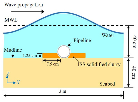 As for inland engineering, the ISS-solidified soil was generally used for ground improvement because of its cost-effective and eco-friendly [31,32]. But for ocean environment, when the ISS-solidified slurry was poured in scour pits, it may damage the habitats of benthic fauna that need soft soil to hide from predators, so it is necessary to further conduct an eco-friendly evaluation for benthic fauna. Compared with the countermeasure of placing protection materials or installing additional structures adjacent to the pipeline [25,27], the ISS-solidified slurry is a novel attempt for scour protection around the pipeline. As for other types of marine structures, e.g., monopiles and marine energy structures, the ISS-solidified slurry can also be used as a scour protection layer around the fixed foundations, and can be poured adjacent to the foundations immediately after the foundations were installed, or in the growing scour holes. In August 2019, a Chinese power investment corporation adopted the ISS-solidified slurry as scour protection layer around the monopile of offshore wind turbines (OWTs) in North Binhai District, East China Sea. The results proved the scour around the monopile was effectively prevented, instructing that the ISS-solidified slurry is a quite valid, economic strategy for scour protection around foundations. In the present study, the ISS-solidified slurry was used as the scour protection layer around the pipeline in waves and combined waves and current.