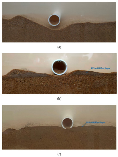 It is noteworthy that the breakthrough of sediments in Figure 5c at the lee-side of pipeline was a progressive process, and each wave cycle disturbed and loosen some soil particles on the exiting side [8]. The breakthrough process mainly depended on the soil porosity, internal frication, and length of the seepage flow path [2,8,19]. Compared with the initial seabed, the ISS-solidified seabed needed more time, i.e., suffered more wave cycles, to make a breakthrough. For example, for case INI-1, it required about 10 s (about 7 wave cycles) to reach a breakthrough point, but for case ISS-A-1, the breakthrough occurred when t = 60 s, and for ISS-C-1, there was no breakthrough even if it suffered 1200 wave cycles, and as a result, no piping occurred. The results indicated that if a proper design mixture ratio is chosen for ISS-solidified slurry, it can work perfectly to prevent the piping beneath the pipeline.