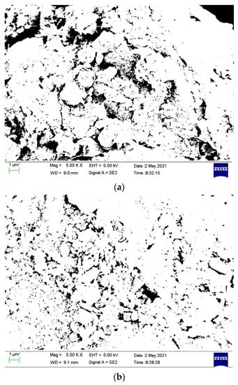 As shown in Figure 7, for the untreated soil, the soil particles emerge as a small aggregation and loose stack of clay platelets. For ISS-solidified soil, the clay platelets aggregate together and form into much larger grain clusters. Figure 8 gives the binary SEM photos for the untreated and ISS-solidified soil samples. The white and black regions in Figure 8 represent soil grains and pores, respectively. Compared with an untreated soil sample, the amount and size of pores decrease significantly, indicating the soil becomes denser after being solidified.