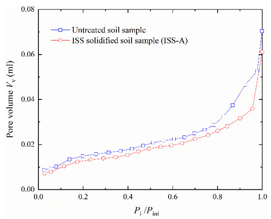 In order to further evaluate the pore volume for the untreated and ISS-solidified soil sample, the pore size tests were conducted. The samples used in pore size tests are same as the SEM tests. The steps for pore size tests are listed below. (1) Crust the dry soil sample and pass through a 0.25 mm sieve. (2) Shift the soil sample into a vacuum machine and vacuumize the specimen. (3) Put the soil sample into the pore size analyzer to test the pore volume. Figure 9 shows the pore volume for the untreated and ISS-solidified soil samples under different pressures.