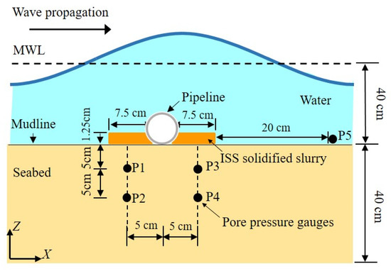 The ISS-solidified layer has a dense structure and greater shear modulus, so it likes a crust layer, and if a non-cohesive soil layer exists underneath the ISS-solidified layer, it may inhibit the dissipation of pore pressure and result in the buildup of pore pressures that can cause accumulated liquefaction. Therefore, it is vital to further evaluate the effects of the ISS-solidified layer for liquefaction stability of non-cohesive subsoil. The experiments were conducted in a wave flume. The flume, soil, pipeline model, and production process of the ISS-solidified soil are the same as Section 2, and it will not be repeated here. To obtain the instantaneous pore pressure in the seabed, the pore pressure gauges were placed in seabed before tests, and the layout of pore pressure gauges was shown in Figure 10. Table 2 lists the test plan and detailed test parameters. The water depth d was 40 cm, and it stayed consistent in all tests. The regular waves were employed with wave height Hw ranging from 6 cm to 18 cm. According to the liquefaction criterion deduced by Zen and Yamazaki [40], when the accumulated pore pressure Pres exceeded the mean normal effective stress σ0, i.e., Pres/σ0 ≥ 1, the liquefaction occurred. The cycle stress ratio χ for every case was computed by the following equation based on Sassa and Sekiguchi [41].