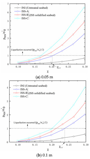Figure 12 depicts the curves between Pres/σ0’ and χ at depth of 0.05 m and 0.1 m. There are two pore pressure gauges in the same depth, and one of the greater Pres/σ0’ was adopted in Figure 12. As shown in Figure 12, the initial liquefaction did not occur for the untreated seabed, but it occurred in the non-cohesive seabed underneath the ISS-solidified layer when the cyclic stress ratio χ equaled the critical cyclic stress ratio χcr. This phenomenon shows that the ISS-solidified slurry likes a dense crust layer, so the pore pressure in the non-cohesive seabed has difficulty dissipating, consequently resulting in accumulated liquefaction. For the χcr, there are obvious discrepancies between the different types of ISS-solidified slurry, indicating the χcr is closely related to the mixture ratio of ISS-solidified slurry. For example, the χcr for case ISS-A is significantly larger than that of case ISS-B. Moreover, the χcr varies with depth, and the deeper depth generally required the relative greater χcr. In practice, the effects of accumulated liquefaction on the non-cohesive seabed beneath the ISS-solidified layer should be considered and designed carefully. For example, to make sure the incipient liquefaction does not occur at a fixed depth, the χ < χcr should be satisfied; otherwise, the mixture ratio of ISS-solidified slurry should be changed until χ < χcr is reached.