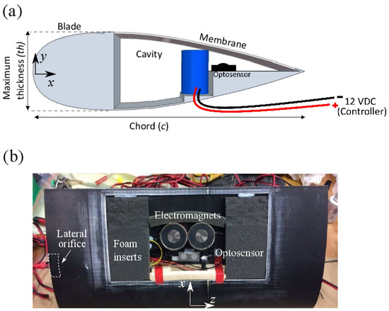 (a) Side view of blade cross section, with cavity covered by the membrane, (b) Top view of final assembly with cavity, electromagnets, optosensor, supporting foams and wooden spars.