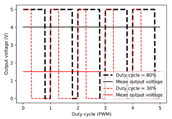 The deformation of the membrane was controlled by means of a pulse width modulation (PWM) signal. As shown in Figure 2, different PWM duty cycles are equivalent to different mean output voltage levels. In the figure, for example, two duty cycles of 30% and 80% are shown with dotted red and black lines, and their corresponding mean output voltages (1.5 and 4 VDC) are highlighted in solid red and black lines, respectively. In this example, we note that a 100% duty cycle would be equivalent to 5 VDC.