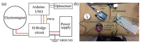 An schematic and an image of the circuit to control the electromagnet and measure the output signal of the sensor is shown in Figure 3a,b. respectively. In the figures, the main components are: the Arduino UNO, the L298N H-Bridge printed board, the electromagnet and the optosensor. In Figure 3a the red and black wires denote positive and negative polarity, whilst the brown wire denotes a signal. The external power supply depicted in Figure 3a is not visible on Figure 3b. Ground is common to all components of the circuit.