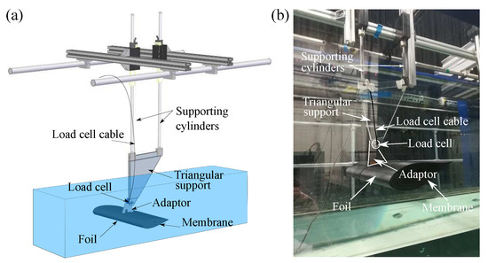 Figure 4a,b show an schematic and an image of the experimental apparatus, respectively. The rig consisted of a six-mm thick acrylic triangular support, which was connected at its lower end to the cable side of a six-axis load cell. The load cell was connected to an adaptor piece that held the foil in place. The adaptor had two supporting arms that reduced spanwise vibrations of the foil. Load cell measurements were sampled at 1000 Hz and data was acquired for 1 min at low, intermediate and fast actuation frequencies. The rig was held in place with two supporting cylinders, whose vertical position could be modified to set the submergence depth of the foil.