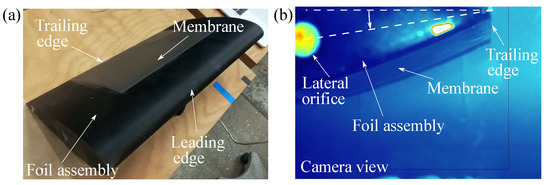 (a) Final assembly of blade showing the membrane at the suction side of the blade and (b) side view from the blade with the membrane at an angle of attack of in the water tunnel.