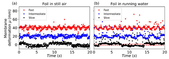 The membrane deformation was measured both in still air and in running water in the water tunnel. Results are presented in Figure 6a,b, respectively. The aim of the test in air was to check the operation of the assembly, whilst the test in water was performed to check that the membrane would deform under hydrodynamic loads. In the figures, the output of the optosensor is plotted for the slow, intermediate, and fast actuation frequencies with black, blue, and red markers, respectively. Figure 6a shows the test in still air, whilst Figure 6b shows the test in running water. In both figures, the intermediate and fast actuation measurements are plotted with a vertical offset of 20 and 40 mm, respectively, whilst the slow actuation measurement does not have an offset.