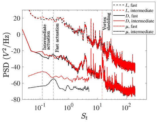 Lift and drag forces were recorded for a duration of at the three actuation frequencies. The power spectral density (PSD) of the L and D force measurements, and of the membrane deformation measurement () are plotted versus the Strouhal number () in Figure 8. Fast and intermediate actuation are plotted. Fast actuation is shown in black, whilst intermediate actuation is shown in red. Slow actuation is not plotted since no discernible peaks were detected in the signals. In the figure, the dotted lines correspond to L, the solid lines to D, and the dashed dotted lines to . For clarity, the PSD of and L are displaced by a negative and a positive offset, respectively. We recall that , where f is the frequency, c is the chord of the foil, and U is the free stream velocity.