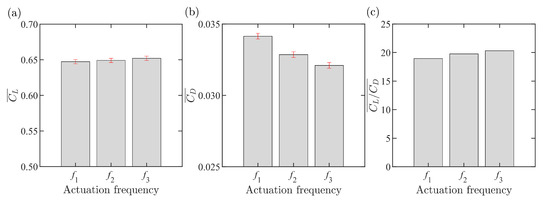 The measured time averaged , and at are shown in Figure 9a–c, respectively. In each subfigure, the three membrane actuation frequencies (—slow, —intermediate, —fast) are shown from left to right. Results in Figure 9a,b show a 1% increase in the mean and a 6% drop in the mean , as the membrane actuation changes from to . The gain in lift and drop in drag coefficients translate into a gain in the mean / ratio. This is shown in Figure 9c, as the actuation frequency changes from to . Error bars are included in Figure 9a,b, to highlight and , as computed in Section 2.8. It is noted that although the differences in are small, the differences in are significant and surpass the computed error bars.