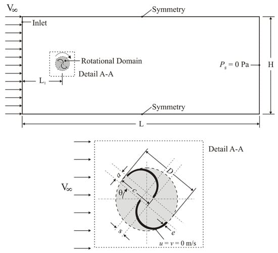 Figure 1 illustrates the computational domain of Case 1 used for verification/validation of the present model. The domain consists of a long and large channel with an inserted free Savonius turbine. The dimensions are similar to those investigated in the work of Akwa et al. [49]. In this case, the fluid flow of air is caused by the imposition of a constant velocity (V∞) at the inlet (left side surface). On this surface, there is also an imposed turbulent intensity of IT = = 1.0%, where u’ is the fluctuation of the velocity field, is the time-averaged velocity field, and σu represents the variance of u’. At the exit of the channel (right side surface), there is an imposed null gauge pressure (pg = 0 atm). At the upper and lower surfaces, there is a free slip and impermeability boundary condition (also called symmetry). In the turbine region, there is an imposed constant angular velocity (n) in the gray region named the “Rotational Domain” simulating the effect of wind action over the turbine. In the turbine walls, there is an imposed no-slip and impermeability boundary condition (u = v = 0 m/s) related to the rotational domain. Figure 1 illustrates the details of the turbine region with the geometric variables used to design it. Table 1 presents the parameters of the fluid flow, thermo-physical properties, dimensions of the computational domain, and turbine variables used here for the four different tip speed ratios of the rotor (λ = nD/2V∞) of λ = 0.75, 1.00, 1.25, and 2.00; n is the angular velocity of the turbine and D is the turbine diameter. For the unsteady analysis, there was a time interval of tf = 3.5 s, with the last 1.75 s being analyzed for computation of the drag, lift, momentum, and power coefficients.