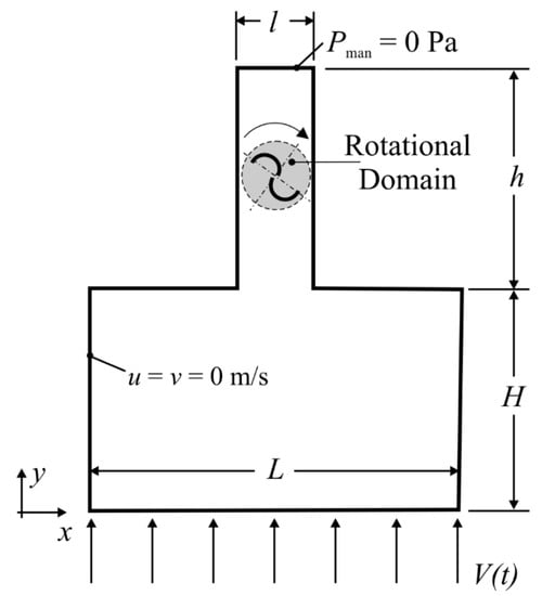 Figure 2 illustrates the computational domain used in Case 2 and Case 3. These cases were defined based on Case 1. Therefore, the thermo–physical properties and dimensions of the turbine were the same, presented in Table 1 (Case 1). The main differences here are the domain dimensions (H = h = 6.0 m, L = 10.0 m, and l = 2.0 m) and the insertion of the Savonius turbine in an enclosure domain, leading to the imposition of a no-slip and impermeability boundary condition (u = v = 0 m/s) in the device walls. At the lower surface, there was an imposed constant velocity of V(t) = 1.4 m/s and IT = 1.0% for Case 2. The magnitude of the imposed velocity was defined in such a way to have a value of 7.0 m/s at the inlet of the air duct (in the contraction from the chamber to the air duct), leading to a Reynolds number in the turbine similar to that reached for Case 1. For Case 3, the sole difference in comparison with Case 2 was the imposition of a sinusoidal function that mimicked the oscillating behavior in the OWC chamber: