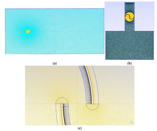 Concerning spatial discretization, hybrid triangular and rectangular finite volumes were used with the domain in simulations of Case 1, Case 2, and Case 3. Figure 3a–c illustrates the mesh generated with software GMSH [58] for the free Savonius turbine (Case 1), the configuration similar to the OWC device (Case 2 and Case 3), and a detail of the mesh in the blades of Savonius turbine, respectively. In detail, it is possible to observe a region around the blades with the refined rectangular mesh. The dimensions of the rectangular volumes were defined as a function of a grid independence study and the parameter for representation of the boundary layer (y+), which must be y+ ≤ 1.0 in the walls; y+ was defined as follows [51,52,53]: