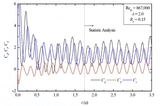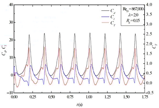 Transient coefficients of the lift (Cl), drag (Cd), and torque (CT) for the free turbine case with ReD = 867,000, Rs = 0.15, and λ = 2.0.