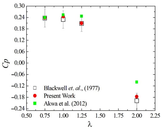 Figure 5 shows the comparison of power coefficients (CP) as a function of the tip speed ratio (λ) obtained with the present computational model and the numerical predictions of Akwa et al. [49] obtained with other commercial code (Star-CCM+) also based on the FVM and the experimental results of Blackwell et al. [48]. The results predicted with the present method are in close agreement with those previously obtained in the literature, verifying and validating the method used here. Even for λ = 1.00 and 2.00, where the highest differences between the present results and the experimental ones were obtained, the deviations were lower than the uncertainty of the experiment. The results indicated that the highest magnitudes of were reached at the lowest values of λ. With the increase in λ, the magnitude of had a slight decrease in the range 1.00 ≤ λ ≤ 1.25 and a step decrease for λ ≥ 1.25. For λ = 2.00, negative magnitudes of were obtained, indicating that the device supplies energy for the fluid flow and not the contrary.