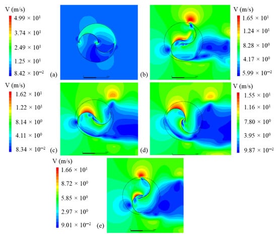 Velocity fields around the free turbine (Case 1) with ReD = 867,000 and λ = 1.25: (a) t = 0.0 s, (b) t = 0.53 s, (c) t = 1.05 s, (d) t = 1.58 s, and (e) t = 2.10 s.