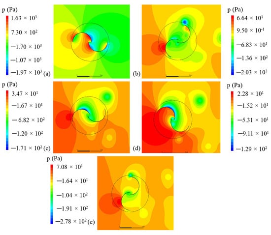 Pressure fields around the free turbine (Case 1) with ReD = 867,000 and λ = 1.25: (a) t = 0.0 s, (b) t = 0.53 s, (c) t = 1.05 s, (d) t = 1.58 s, and (e) t = 2.10 s.