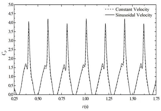As previously mentioned, the air flow in the OWC chamber is subjected to the piston-type oscillatory motion of the water column (hydropneumatic chamber). In order to simulate this effect, the results of instantaneous power coefficient obtained for Case 3 and Case 2, considering the same conditions (ReD = 867,000, λ = 2.0, and RS = 0.15), are presented in Figure 9. It is important to reinforce that, for prediction of CP for Case 2 and Case 3, Equation (6) was used instead of Equation (5), and the time-averaged magnitudes were predicted with Equation (7). The results reveal a strong similarity between the instantaneous CP for both cases, indicating that the imposition of sinusoidal velocity at the inlet of the domain did not have a significant influence over the pattern of the CP investigated here, which is not intuitively expected since the mean imposed momentum decreased for Case 3 in comparison with Case 2. The results also demonstrate a slight increase in the power coefficients when the sinusoidal velocity was imposed, with a difference of nearly 9.0% on average. Possible explanations for the behavior found here include the synchronization of velocity augmentation with the rotation of the turbine and the imposition of the rotational domain, as well as the acceleration of the fluid caused by the variation of the imposed velocity at the inlet for Case 3, which did not happen for Case 2. The magnitude of the imposed mean velocity at the inlet of Case 2 and Case 3 and acceleration at the inlet for Case 3 are illustrated in Figure 10 to make this visualization easy. It is worth mentioning that, despite different imposed inlet velocities, the transient fields of velocity and pressure had only slight differences. Future investigations should be performed with other magnitudes of amplitude and periods of imposed velocity to corroborate this hypothesis and the development of other models where the inertia moment of the turbine is taken into account.