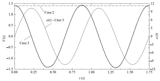Magnitude of the imposed velocity at the inlet of the OWC domain for Case 2 and Case 3 and acceleration of the fluid at the inlet of the domain for Case 3.