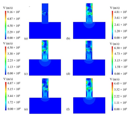 Velocity fields for the OWC case with sinusoidal velocity at the inlet for different instants of time for the case with ReD = 867,000, λ = 2.0, and RS = 0.15: (a) t = 0.0 s, (b) t = 0.26 s, (c) t = 0.53 s, (d) t = 0.79 s, (e) t = 1.05 s, and (f) t = 1.31 s.