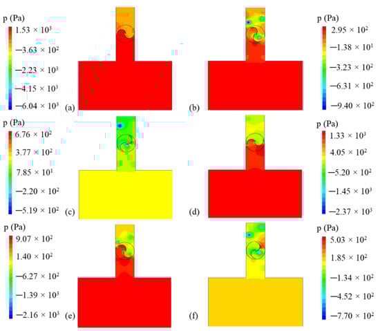 Pressure fields for the OWC case with sinusoidal velocity at the inlet for different instants of time for the case with ReD = 867,000, λ = 2.0, and RS = 0.15: (a) t = 0.0 s, (b) t = 0.26 s, (c) t = 0.53 s, (d) t = 0.79 s, (e) t = 1.05 s, and (f) t = 1.31 s.