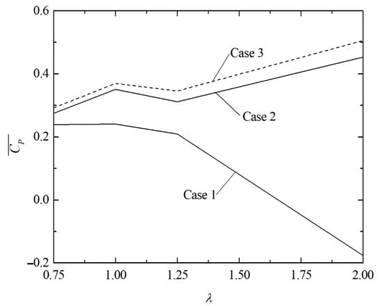 To summarize, Figure 13 shows the effect of λ on the time-averaged magnitudes of and for Case 2 and Case 3, and Figure 14 illustrates the same effect considering only for Case 1, Case 2, and Case 3. The results indicate that the differences between the values of the aerodynamic and power coefficients obtained for Case 2 and Case 3 were not significant, with the highest difference being lower than 10.0%. The effect of λ on the coefficients was also similar for both cases. Concerning the magnitude of , it decreased in the range 0.75 ≤ λ ≤ 1.00, and after this point, the magnitude was almost constant. The and magnitudes decreased with the increase in λ. However, for the decrease was more significant only in the range 1.00 ≤ λ ≤ 1.25, being almost constant in other intervals of λ. For the , there was an increase with the augmentation of λ. For Case 3, for example, the magnitude increased from = 0.2922 when λ = 0.75 to = 0.5054 when λ = 2.0. Figure 14 indicates that in the region 0.75 ≤ λ ≤ 1.25, a similar trend of was noticed when Case 1 and the enclosure cases (Case 2 and Case 3) were compared. However, for λ = 2.0, contrary to the behavior noticed for Case 1, Case 2 and Case 3 did not have a reduction of for the highest magnitude of λ investigated. Therefore, the results indicated that changes in the domain where the turbine is placed are important to define its application range and the effect of λ over the problem performance. Further studies should be performed to define the range of application of λ for the enclosure domain.