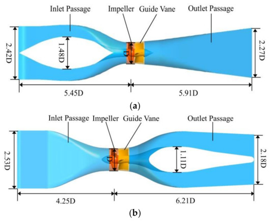 The inlet passage is the connection between the forebay and the impeller chamber. The purpose is to make the flow uniform and smooth and provide a good inlet condition for the impeller. The outlet passage is commonly used to recover kinetic energy [19]. In this research, two tubular pump devices with different shaft position were studied. Both pump devices adopt a TJ04-ZL-06 pump model. Figure 1 shows the model of two pump devices. Table 1 shows the design parameters of two pump devices.