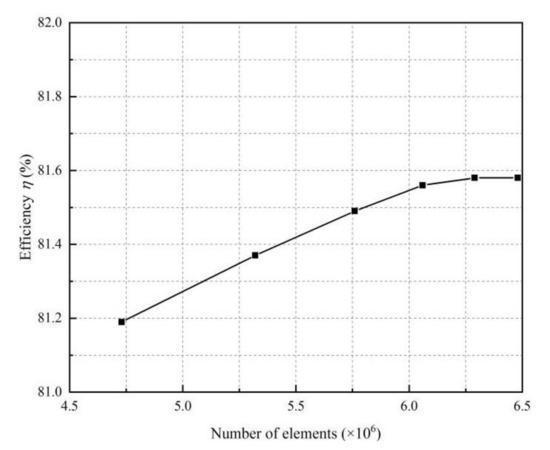 According to the design parameters, flow passage components of pump devices are modeled, and the grid is divided in ICEM software. The impeller and guide vane are modeled according to coordinate points and divided into structural grids in TurboGrid Software. A large number of studies show that the value of y+ and the setting of tip clearance will affect the calculation accuracy [31,32,33]. The tip clearance was 0.15 mm in this calculation. The y+ value of the impeller wall was 18. In this study, six sets of grids were divided for the calculation domain, and the efficiency of the shaft front-positioned tubular pump device under design condition was used as an index to judge grid independence. Figure 3 shows that the efficiency is almost constant when the grid number is more than 6.29 million. When the number of grids continues to increase, efficiency changes less than 0.03%. The grid number of 6.29 million was finally selected, and the grid of the shaft rear-positioned tubular pump device was also divided according to this scheme. Figure 4 shows the grid division of each part.