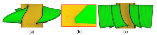 Figures of grids: (a) impeller; (b) grid refinement of impeller tip; (c) guide vane.