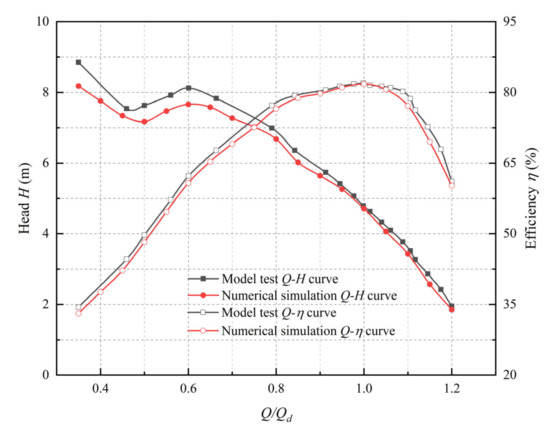 Figure 6 compares the numerical simulation results with the model test results; under design condition (Qd = 388 L/s), the experimental efficiency value is 81.93%, the efficiency predicted by the CFD is 81.78% and the absolute error is only 0.15%, the relative error is 0.18%, which is within the allowable range. The experimental head value is 4.79 m, the head predicted by the CFD is 4.71 m and the absolute error is 0.08 m, the relative error is 1.7%. The characteristic curves obtained by experiment and numerical simulation are basically the same, indicating that the numerical simulation method is reliable.