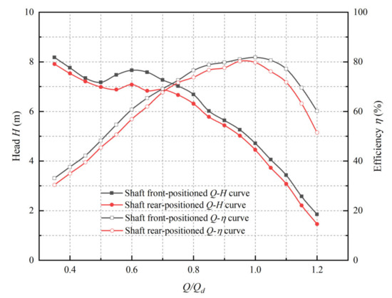 According to the numerical simulation results, the head and efficiency of pump devices were calculated, and the Origin software was used to draw the curves. Figure 7 shows the Q-H and Q-η curves of the two pump devices; the trend of the external characteristic curves of two pump devices is basically the same and the shaft front-positioned pump device has higher efficiency than the shaft rear-positioned pump device. This is consistent with the results in reference [9], however the efficiency of pump devices in this study is higher. Under design flow rate condition, the head of the shaft front-positioned tubular pump device is 4.71 m and its efficiency is 81.78%, and this working condition is the optimal working condition. The head of the shaft rear-positioned tubular pump device is 4.45 m and efficiency is 79.73%. When the Q/Qd = 0.95, the efficiency of the shaft rear-positioned pump device is the highest, and the peak efficiency is 80.26%, the head is 5.02 m. The maximum efficiency difference between the two pump devices is only 1.52%. Under design condition, the hydraulic performance of both pump devices is excellent, which exceeds the standard Chinese requirements (GB50265-2010) that the efficiency of axial flow pump stations and mixed flow pump stations should not be less than 70~75%. Results show that the two tubular pump devices have high application value.