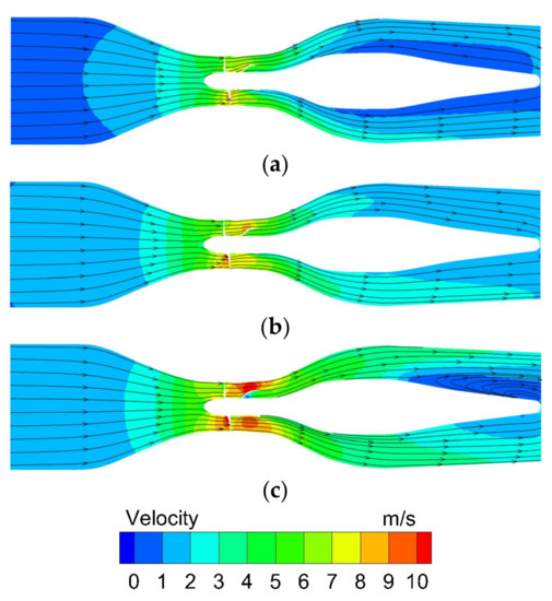Streamlines and velocity contour on cross section in shaft rear-positioned tubular pump device: (a) Q/Qd = 0.8; (b) Q/Qd = 1.0; (c) Q/Qd = 1.2.