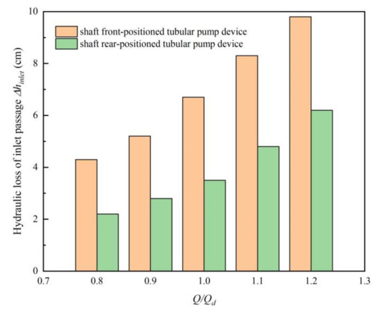 Figure 10 shows the hydraulic loss of inlet passages under different conditions, it can be found that when the flow rate increases, the loss also increases, and the loss is related to the quadratic of flow. The hydraulic loss of two inlet passages is within 10 cm, and the loss of shaft front-positioned inlet passage is slightly larger. The reason for this gap is that the shaft is set in the passage, resulting in a slightly larger velocity than the straight inlet passage.