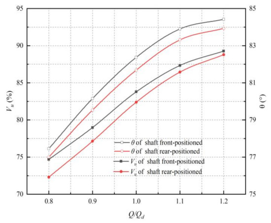 The results in Figure 11 suggest that Vu and θ increase with an increasing flow rate, in the calculation conditions, Vu and θ at the shaft front-positioned inlet passage outlet are larger than those of the straight inlet passage, and when the flow rate increases, the gap between the two decreases gradually. In the design condition, the hydraulic loss of shaft inlet passage is 7.4 cm, and Vu = 83.78%, θ = 82.37°, whereas the hydraulic loss of straight inlet passage is 3.9 cm, and Vu = 82.39%, θ = 81.68°. Overall, both inlet passages have excellent hydraulic performance. According to Figure 10 and Figure 11, it can be found that the hydraulic performance of two inlet passages is excellent, and the hydraulic loss is close to each other.