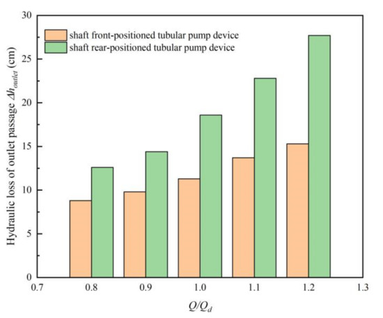 Figure 12 shows the hydraulic loss of outlet passages under different conditions, it can be found that the loss increases with increasing flow rate. Under design conditions, the loss of straight outlet passage is 11.3 cm, while that of the shaft rear-position outlet passage is 18.6 cm, and the ratio of two outlet passages is 0.608. When the Q/Qd = 0.8, the loss of straight outlet passage is 8.8 cm, while that of the shaft rear-position outlet passage is 12.6 cm, and the ratio of two outlet passages is 0.698. When the Q/Qd = 1.2, the loss of straight outlet passage is 15.3 cm, while that of the shaft rear-position outlet passage is 27.7 cm, and the ratio of two outlet passages is 0.552. With the increase of flow rate, the loss of the straight pipe outlet passage is much smaller than that of the shaft rear-position outlet passage, which is the reason why the efficiency of the shaft front-positioned pump device is obviously higher under large flow condition.