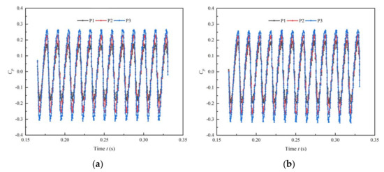Time domain of pressure pulsation at guide vane outlet (Q = Qd): (a) shaft front positioned tubular pump device; (b) shaft rear positioned tubular pump device.
